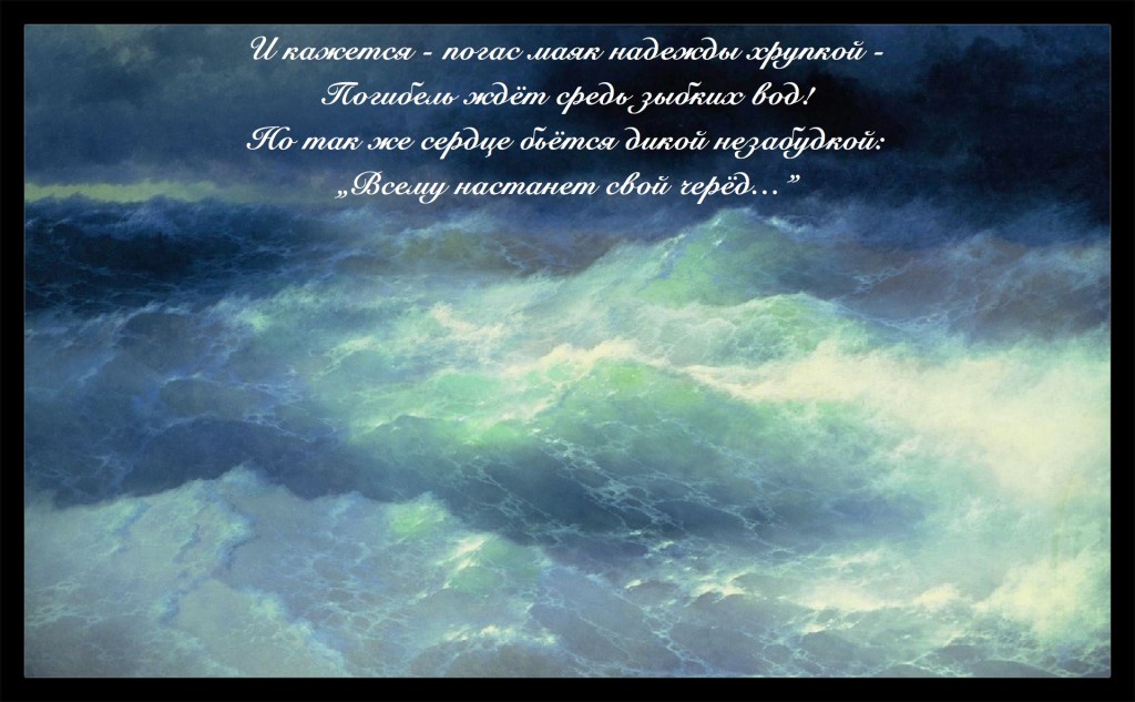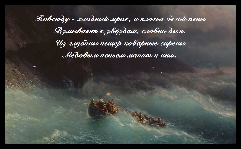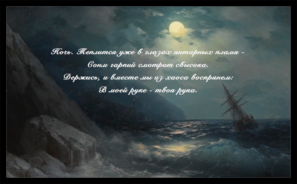 Закат. Морской простор укрыт туманом лунным, Но видится земля вдали. Сгустились облака, и волны, словно дюны, Ласкают наши корабли. Пусть ветер всё сильней тревожит парус лёгкий, Нам непогода не страшна. Меж призрачных камней лавируем мы ловко Под плеск и шумный гул весла. Вдруг разразился гром, и палуба качнулась - Предвестие лихой беды. Лишь молнии стрела - и тьма вокруг сомкнулась: Теперь спокойствия не жди! Повсюду - хладный мрак, и клочья белой пены Взмывают к звёздам, словно дым. Из глубины пещер коварные сирены Медовым пеньем манят к ним. И кажется - погас маяк надежды хрупкой - Погибель ждёт средь зыбких вод! Но так же сердце бьётся дикой незабудкой: „Всему настанет свой черёд…” Ночь. Теплится уже в глазах янтарных пламя - Сонм гарпий смотрит свысока. Держись, и вместе мы из хаоса воспрянем: В моей руке - твоя рука. Над мачтой вьётся буревестник, звонким криком Моля: „Взлетайте же скорей!” вся жизнь нам кажется теперь одним лишь мигом, И не вернуть ушедших дней. Смотри: затоплен трюм, течением жестоким Уже захвачен в плен штурвал! Не нужно слёз, мой друг, ведь мы не одиноки - Любовь затмит девятый вал. Пусть грозный океан разверзнет бездну с воем, Мы не исчезнем без следа: Обломки наших душ стремительным прибоем На берег вынесет волна. Преображённые, вернёмся мы к земному, Свободные от власти лет. Подобно странникам, что возвратились к дому, Увидим первый луч. Рассвет!